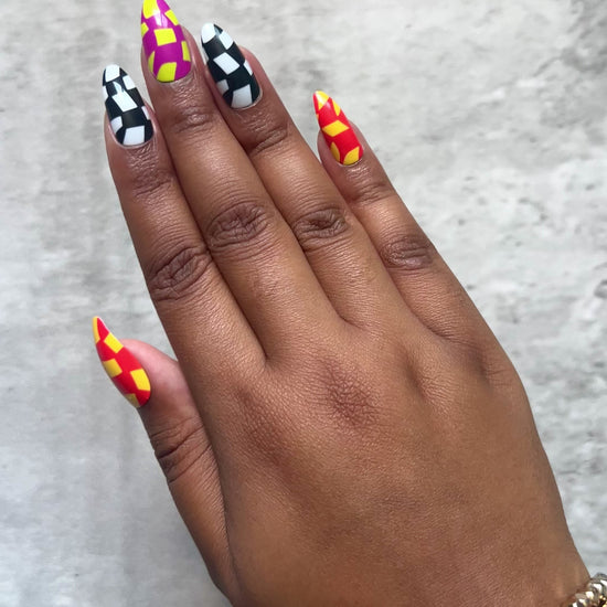 KIARA brings the fun. This almond-shaped press-on nail set features a distorted multicolored checkerboard design—trippy, bright, and full of personality. For the people who don’t do boring and aren’t afraid to bend the rules of beauty.