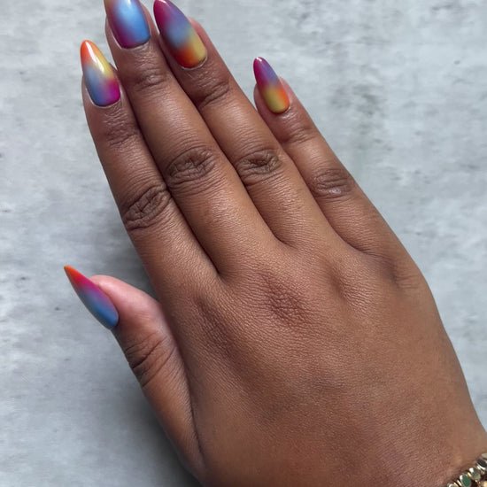 MEI is where color meets confidence. This almond-shaped press-on nail set is a vibrant fusion of summer-ready hues—magenta, blue, yellow, and orange—blended into a bold, feel-good palette. Bright, dynamic, and full of movement.